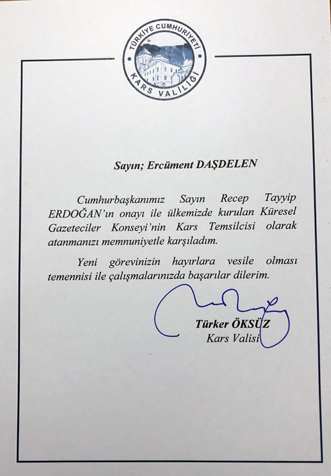 Vali Öksüz, mesajında şu ifadelere yer verdi; “Sayın Ercüment Daşdelen; Cumhurbaşkanımız sayın Recep Tayyip Erdoğan’ın onayı ile ülkemizde kurulan Küresel Gazeteciler Konseyi’nin Kars Temsilcisi olarak atanmanızı memnuniyetle karşıladım. Yeni görevinizin hayırlara vesile olması temennisi ile çalışmalarınızda başarılar dilerim.”